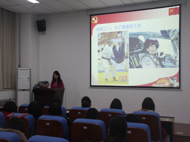 讲座上,曹宇巍以“树立正确的入党动机,争取早日加入党组织”为题向同学们讲解介绍了树立正确入党动机的重要性、共产党员的标准以及号召参加党课的学员用党员的标准严格要求自己,以实际行动争取早日入党。讲座以西方国家名人的入党动机切入,以革命中的仁人志士的坚定意志与对党的信仰为例,深入剖析了怎样的入党动机才是正确的这一问题。她强调,以党员的标准严格要求自己具有特殊的意义,而学习党的理论,牢记党的宗旨,严于律己是成为党员的必备条件。最后,她还向学员们介绍了发展党员的方针和入党的基本程序,并且鼓励学员们以实际行动争取早日入党,成为一名光荣的共产党员。