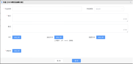5月8日-5月18日,参赛者将参赛作品申报表、承诺书、微课视频、教学设计、教学PPT,以班级+学号+姓名+作品申报表/微课视频/微课教学设计/微课教学设计命名,上传至竞赛系统(校园网登录):http://jsgl.snnu.edu.cn。(将作品申报表上传至承诺书区域、教学设计上传至其他文件区域)。