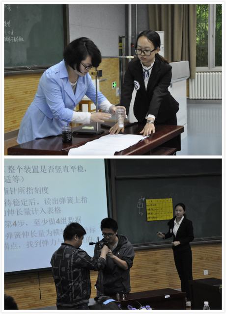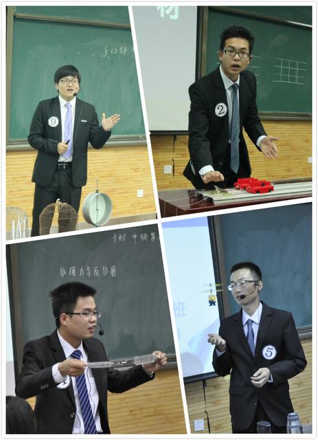 参加决赛的9个团队在班级初赛中脱颖而出。决赛要求团队通力合作,在规定时间内,就高中物理实验进行模拟授课。在比赛过程中,九个团队,根据所选课题,利用实验室已有教具和自制教具,为现场师生带来了一场场精彩的课堂。授课过程重点突出,条理清晰,讲授生动。特别是同学们耳目一新的实验设计,来自生活中的自制实验器材,大胆创新的实验探究,使得枯燥的物理理论知识妙趣横生,通俗易懂。