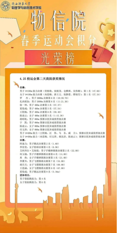 2023425日,清晨微凉,物信院学子却不减激情。微风轻拂运动员脸庞,阳光晖映他们身姿,为他们镀了层金边。让我们一起来看看校运会第二天的精彩瞬间吧!