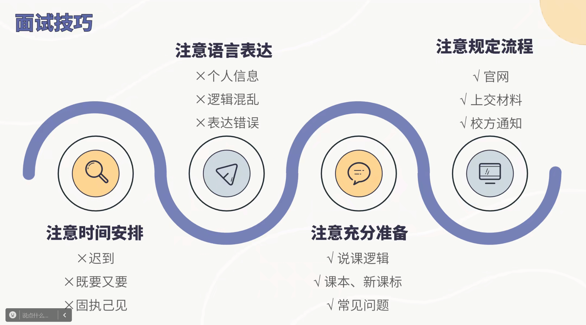 曹嘉璇学姐在分享中指出了就业过程中可能遇到的问题和困难。她强调在校期间应注重个人能力的培养,特别是讲课能力和说课水平。同时,她强调利用在校时间提升就业技能的重要性,她建议同学们掌握面试技巧,明确个人特色,并特别强调需注意面试中的时间安排,完善语言表达和准备流程,把握每一个机会。