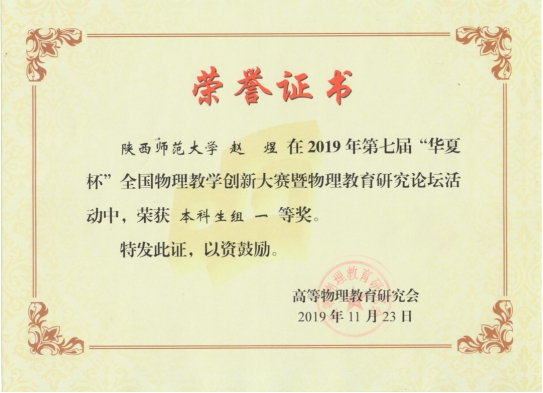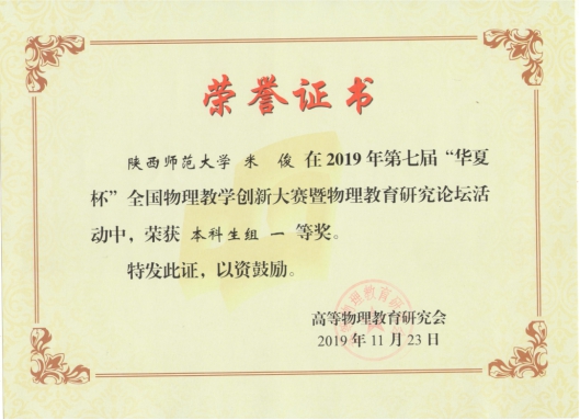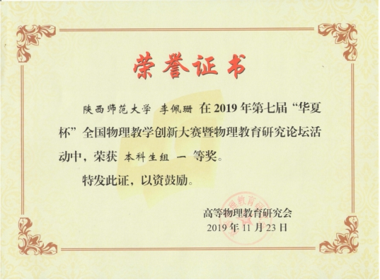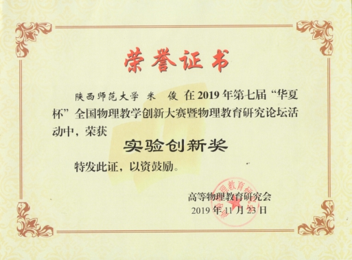 公司2016级本科生米俊、赵煜、李佩珊、王硕、吴婧娴等五位同学参加了教学创新模拟授课大赛,授课比赛由教学设计、模拟授课、现场提问三个部分构成。最终米俊、李佩珊、赵煜等三位同学荣获一等奖,王硕荣获二等奖,吴婧娴荣获三等奖。此外,米俊同学还获得了实验创新奖,并做为创新实验展示选手进行了大赛展示。公司也在本届“华夏杯”全国物理教学创新大赛活动中荣获优秀组织奖。