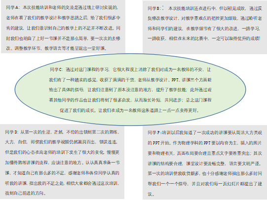 教师认真指导:各位指导教师在接到公司工作安排后,积极组织各小组的员工,借助各种网络工具有计划的开展线上指导,从选题、导入技能和授课技能、教学设计、PPT制作、微课录制等方面引导员工逐项练习。对于在线指导面临的员工实验设备有限、讲课条件受限等问题,教师和员工共同努力克服;针对每个员工的讲授,指导教师除了在线点评外,也做好了详细记录。