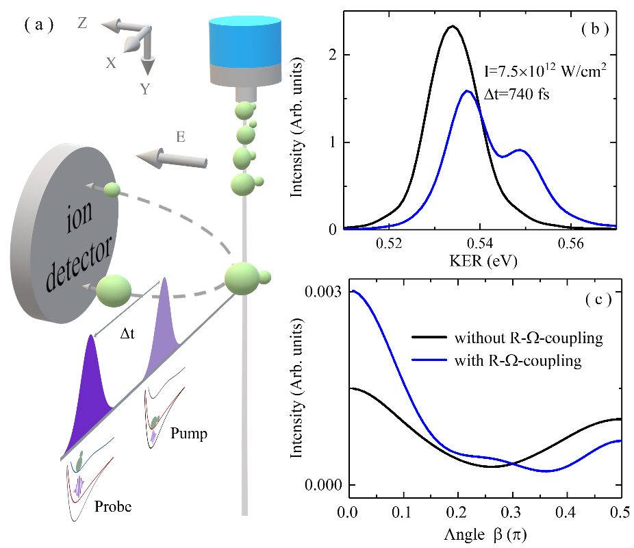 双原子分子的总角动量由电子总角动量在分子轴向的投影Ω和分子的转动角动量R耦合而成,称为电子-转动耦合(R-Ω耦合)。传统上研究激光场与分子相互作用时,分子的转动质量远大于电子质量,R-Ω耦合作用很小,其被合理地忽略。但是随着强激光场技术的应用,电子激发时可能通过多次拉比跃迁累积形成足够显著的动力学效应,R-Ω耦合将对强激光场下的分子取向、光解分子离子碎片角分布等有重要影响。