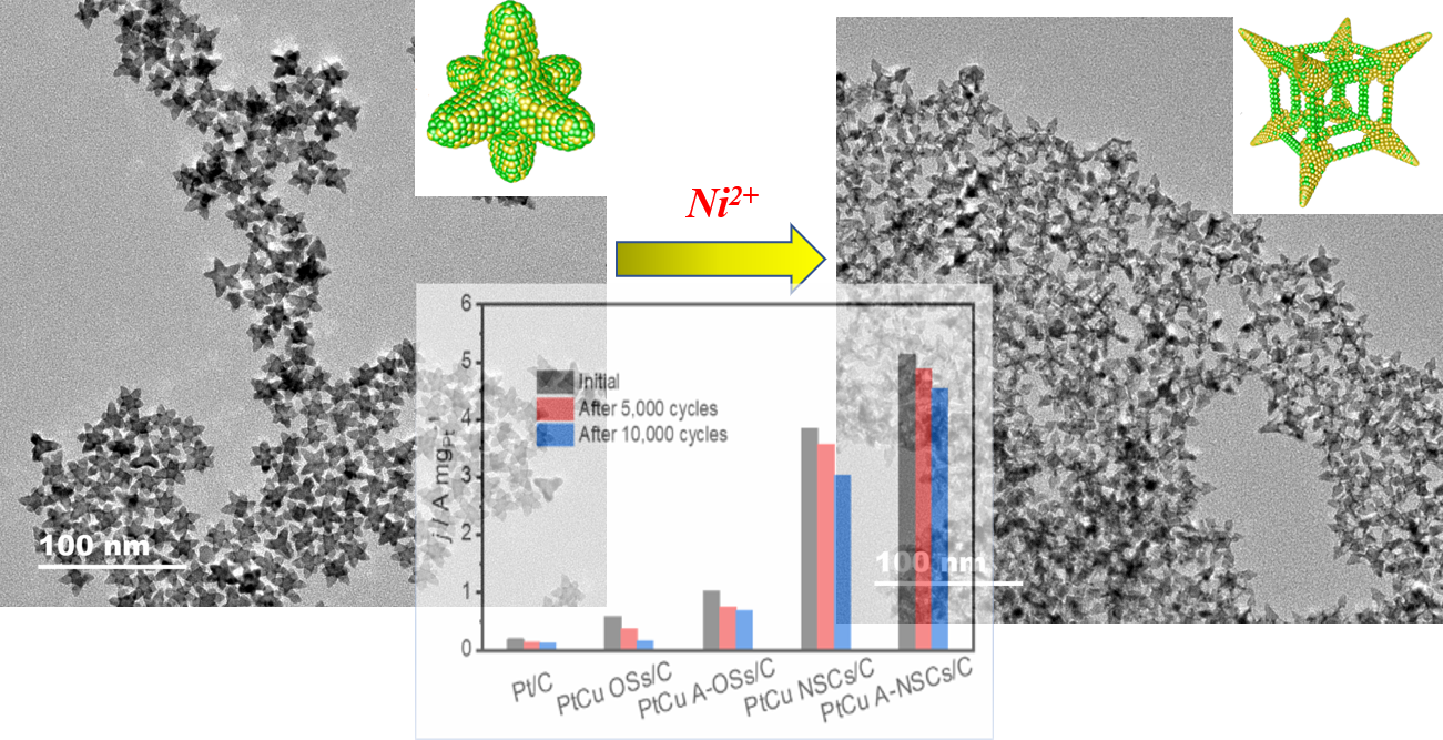 近年来,合金纳米骨架因其高度开放的3D结构可以提供1D可亲近表面、高比表面积、高原子利用率,在催化应用研究方面备受青睐。然而,发展控制力强,技术简单的多层纳米骨架的制备路线仍是挑战。近来,英国365集团尹峰课题组同中科院大连化物所杨冰课题组合作发展了一种溶剂热法,通过在反应溶液中额外添加Ni离子为催化剂,促进高浓度Cu前驱体的还原动力学,并且协助表面活性剂作为结构导向剂,诱导PtCu的各向异性生长,使得产物从PtCu OSs转化为 PtCu NSCs。电化学测试显示此结构的改变使得PtCu NSCs具有优异的ORR催化活性和稳定性。其主要原因为:①嵌套结构中的空腔有利于传质过程;②嵌套结构中超细一维合金脊可以提供大量的活性位点;③ 富Pt皮可以抑制体相Cu在酸介质中的浸出,NSCs中枝状足可以抑制合金3D结构的坍塌以及催化剂的团聚。此项研究为新型纳米骨架材料的设计与制备打开一扇窗户,提供一种新的研究思路。