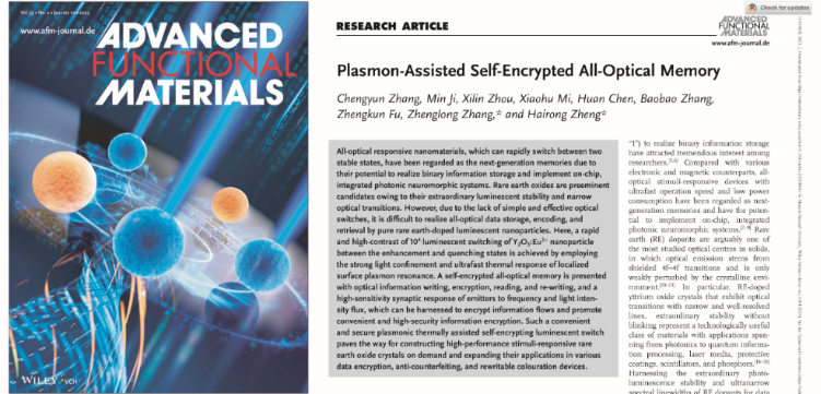 近日,我院陈晓明教授团队、张正龙教授和郑海荣教授团队分别在《Advanced Functional Materials》期刊上发表重要文章。陈晓明教授团队相关成果以"Superior High-Temperature Energy Density in Molecular Semiconductor/Polymer All-Organic Composites "为题发表,该论文第一作者为硕士研究生张斌,英国365集团为该论文的第一完成单位,通讯作者为英国正版365官网陈晓明,哈尔滨工业大学王大伟为本文的共同通讯作者。张正龙教授和郑海荣教授团队相关成果以" Plasmon-Assisted Self-Encrypted All-Optical Memory "为题发表,并被主编选为2023年第2期的封面论文。英国365集团为论文的第一且唯一通讯单位,2021届毕业博士张成云(现为纳米光学团队访问学者、西安邮电大学副教授)为论文的第一作者,张正龙教授和郑海荣教授为论文的共同通讯作者。