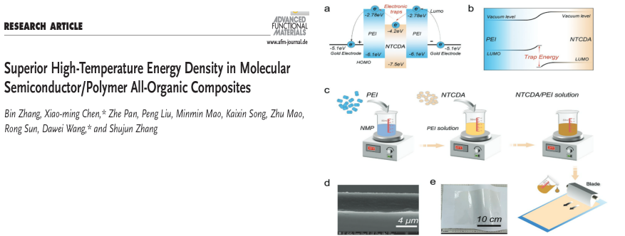 陈晓明教授的电介质物理与材料团队联合哈尔滨工业大学王大伟教授,在聚合物中引入高电子亲和度的小分子半导体,通过构建深电子陷阱从而显著抑制了聚合物在高温高场下的电导。本工作通过将n型小分子半导体1,4,5,8-萘四甲酸二酐(NTCDA)与聚醚酰亚胺(PEI)混合,研制了一系列全有机聚合物复合材料。微量NTCDA在PEI中形成了电子陷阱,有效地降低了PEI在高温下的漏电流,改善了复合材料在高温下的击穿强度和储能性质。含有0.5vol%NTCDA的PEI表现出优异的高温储能性质,在150°C和200°C时放电能量密度分别达到5.1 J/cm3和3.2 J/cm3,放电效率高达85-90%,该结果优于目前最广泛使用的商业介电聚合物BOPP材料的高温性能。这项工作为设计用于先进电子和电气系统的高温电介质聚合物提供了一个简单而有效的策略。