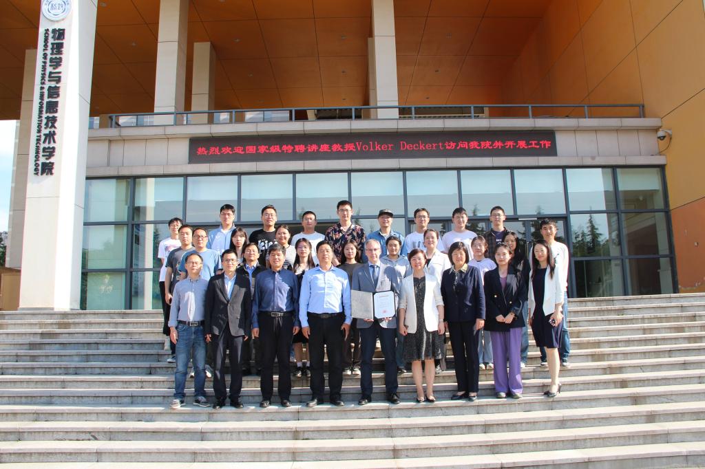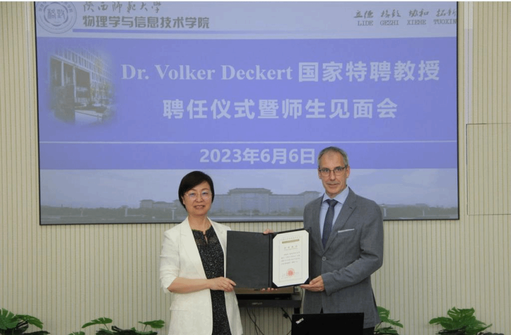 张卫兵宣读了教育部关于聘请沃尔克·德克特为特聘教授的决定。罗永辉为Volker Deckert教授颁发聘书。