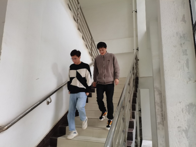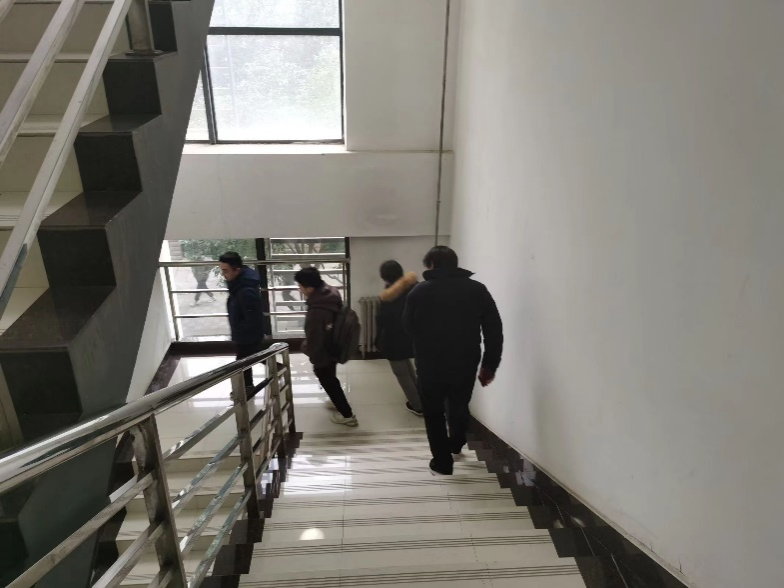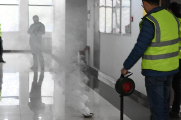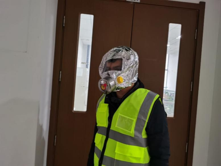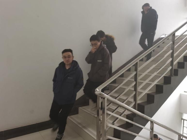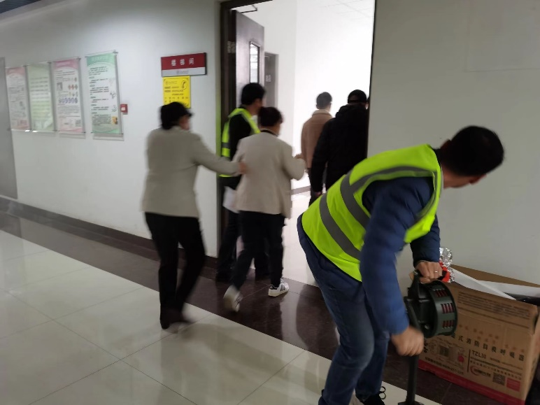 现场模拟致知楼三段2楼东侧发生“火情”,火势迅速向各楼层蔓延,现场浓烟滚滚,且3楼西侧有人员受伤,情况危急,启动公司火灾应急预案,各小组立即展开行动。警报声响起,公司师生用湿毛巾捂住口鼻,低姿、快速地穿越“烟雾”区,按照预定的疏散路线进行撤离,赶往指定的安全地带,楼层负责人确认本楼层无滞留人员后,才离开危险区域前往指定安全区域集合。灭火组穿防火战斗服,携带灭火器到起火现场进行灭火;应急救助小组迅速将“伤员”救援至一层开阔地带。整个疏散过程迅速、有序,师生们均能在规定时间内完成撤离。