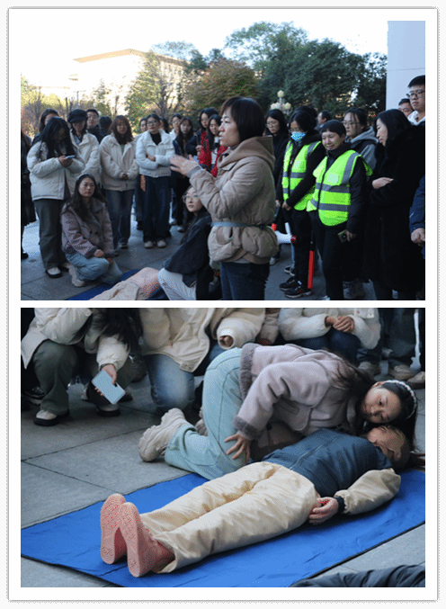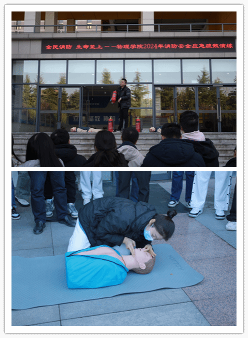 演练的最后环节,校医院医护人员详细讲解了心肺复苏等急救知识,并进行实操展示,工作人员讲解了灭火器的种类、使用方法及注意事项,并指导师生进行实操灭火演练,参加演练的师生踊跃参与。