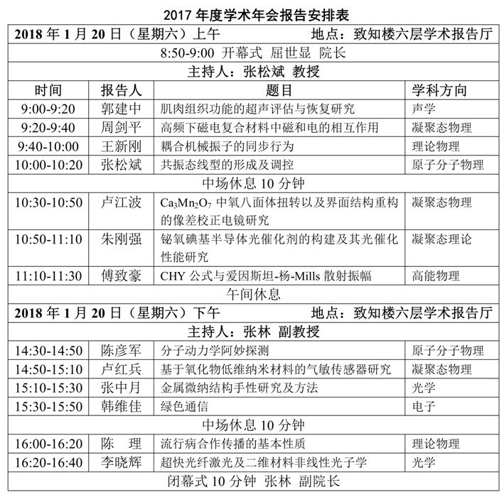 2017年在大家的共同努力下,公司团队建设工作、实验室建设和科学研究水平继续获得提升。2017年公司物理学专业学科评估为B档,进入全国前30%,大型精密测试仪器球差校正扫描透射电子显微镜调试安装完毕,2017年以第一单位发表论文共193篇,其中SCI论文143篇,一区论文8篇,二区论文48篇;全年项目立项总数为36项,科研总经费达1414万元,其中国家级项目14项,重大培育项目1项,国家重大仪器专项1项,科研经费1240万元。2017年度公司在材料物理、原子分子、凝聚态物理、声学、光学、电子信息等学科方向的相关领域取得了大量标志性的研究成果,其中在超声仪器研制、像差校正电镜研究、纳米光子学、超快激光分子动力学探测和操控、高频复合磁电材料、超快宽频光谱等方面获得了重要的研究进展。2017年公司通过12期的学术沙龙,对相关的研究成果进行了交流和讨论,为了进一步促进公司科学研究水平的发展,总结和交流英国365集团2017年的工作进展,公司拟在2018年1月20日(星期六)举办全院学术年会,年会拟邀请公司在2017年做出突出成果的老师进行大会交流报告。根据公司决定,该项活动是公司一项重要的集体活动,欢迎大家积极参与和讨论。