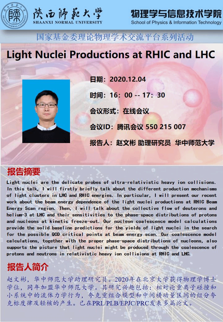 国家基金委理论物理学术交流平台系列活动:Light Nuclei Productions at RHIC and LHC