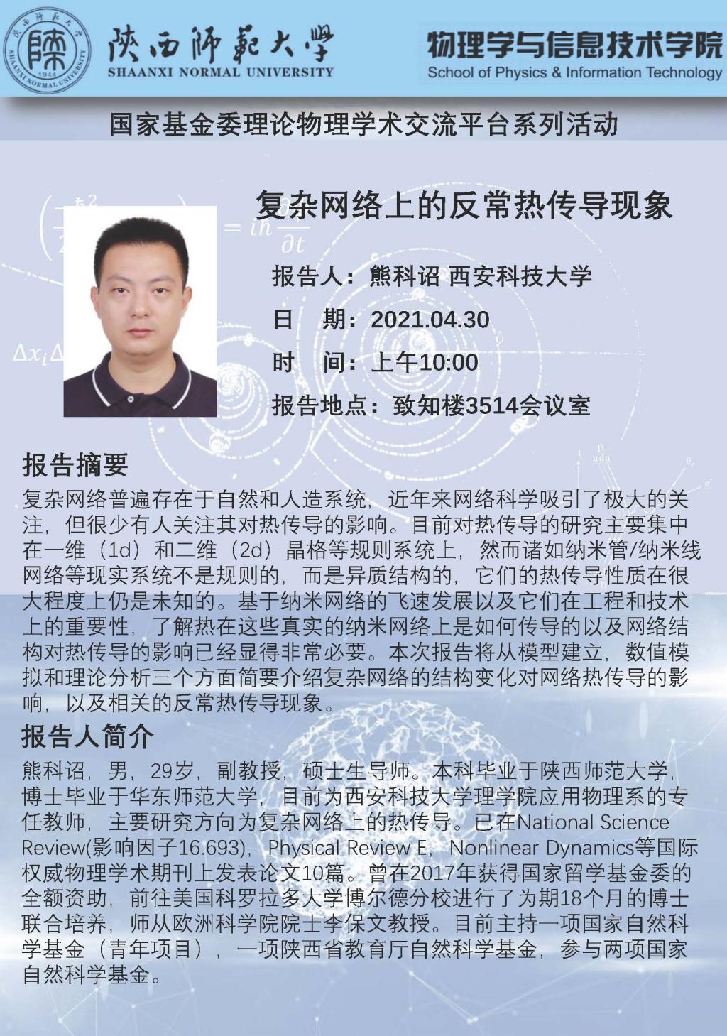 国家基金委理论物理学术交流平台系列活动:复杂网络上的反常热传导现象