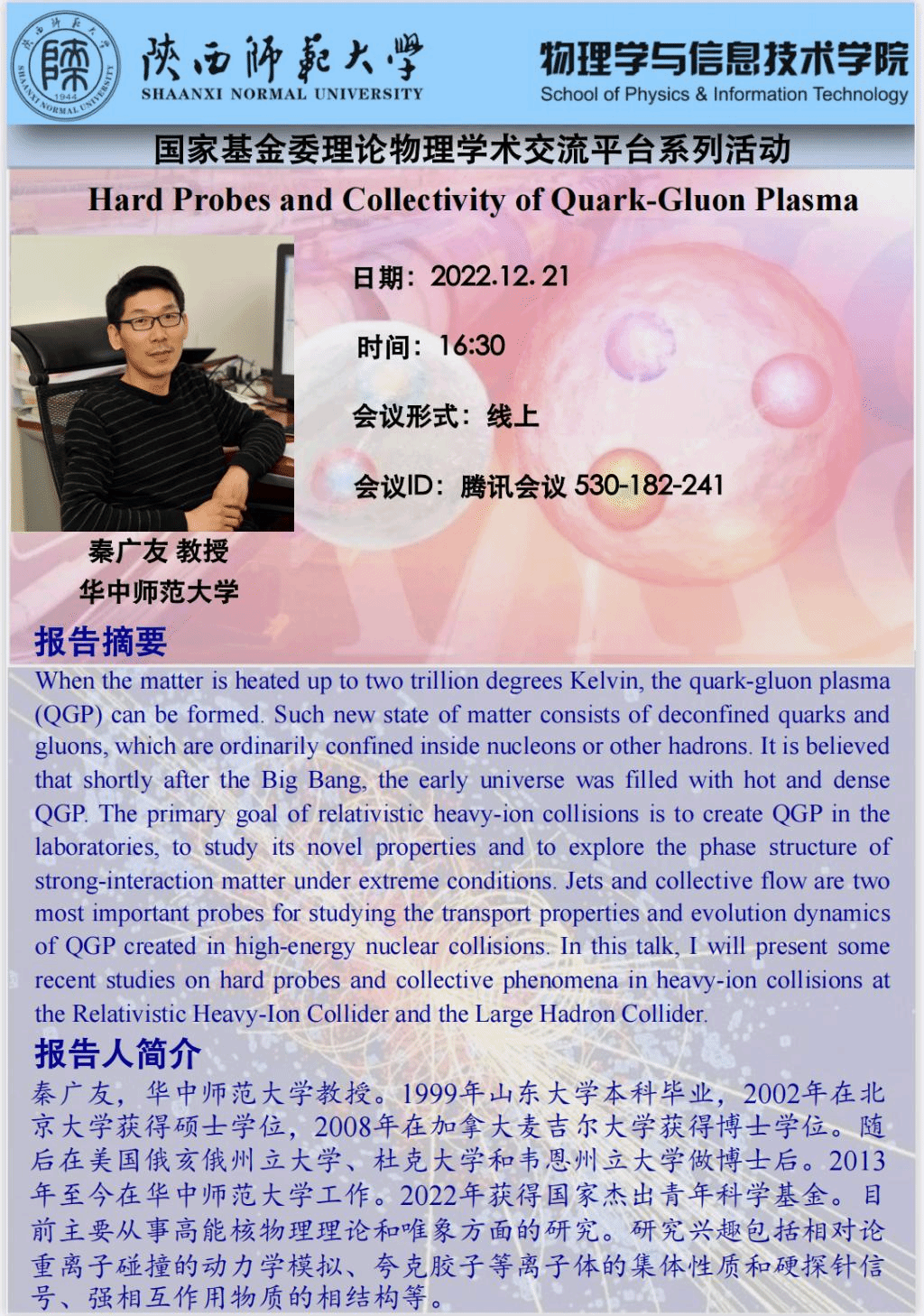 基金委理论物理平台系列活动:Hard Probes and Collectivity of Quark-Gluon Plasma